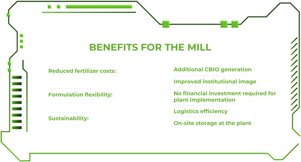 We install our organomineral fertilizer plants inside the mill, using residues from sugarcane production itself (such as filter cake, vinasse, among others), promoting circular economy, profitability and value generation.