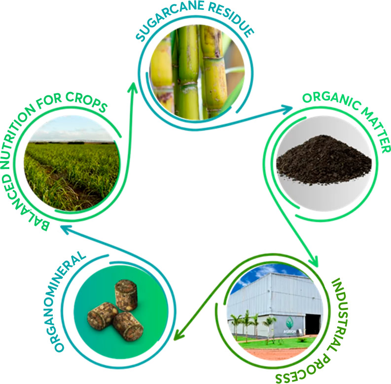 Residues from sugarcane production are treated, stabilized and combined with minerals, resulting in high-performance organomineral fertilizers.
